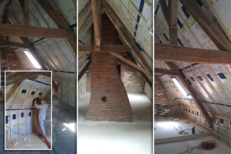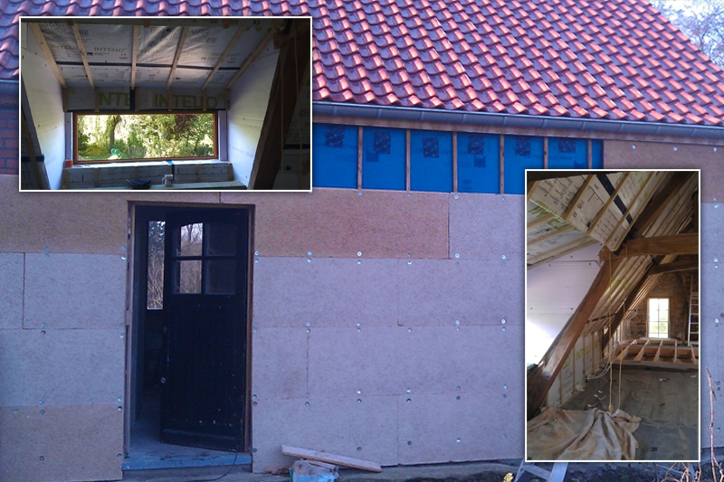 Isolation des sous-pentes, sols de greniers en laine de chanvre, de bois, panneaux de liège compensé, insufflation en ouate de cellulose. Isolation des sols sur dalle de béton: en panneaux de liège compensé 6mm. Isolations extérieures selon possibilités du bâtiment.